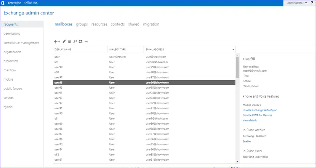 - Click on the Recipient and then subsequently select the Mailbox from the Exchange admin center.