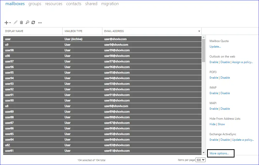 - Select the required number of mailboxes (Pick only the required users for whom you need to assign the mailbox access permission to particular user), and then you need to click on the More options from the bottom of the Exchange admin center.