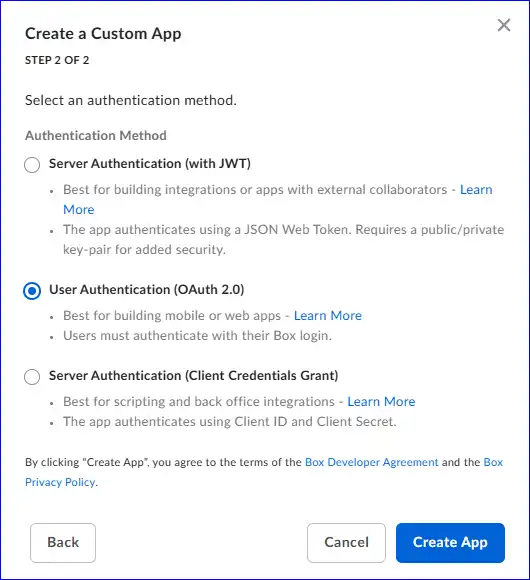 2. For the Box Business/ Enterprise Account: To connect the Box Business/Enterprise Account, you can either connect via JWT Authentication or CCG Authentication.