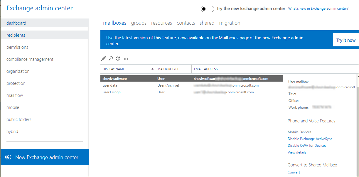 Now from the Dashboard, select recipient from multiple other options. Click on mailboxes to see the list of all users within the organization.